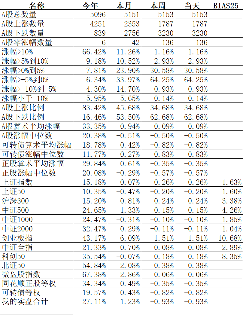 今天不管是全市场还是我的主仓,再次出现杀溢价的现象。这也很正常,也很难预测,满仓轮动长期总有阿尔法收益,短期的杀溢价很难预防,只能听之任之了。