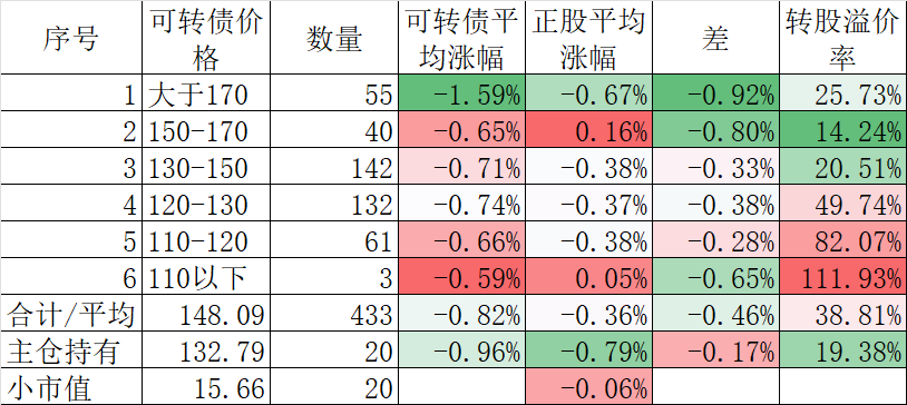 433只可转债平均下跌0.82%,对应正股平均下跌0.36%。我的主仓20只可转债平均下跌0.96%,对应正股平均下跌0.79%。
