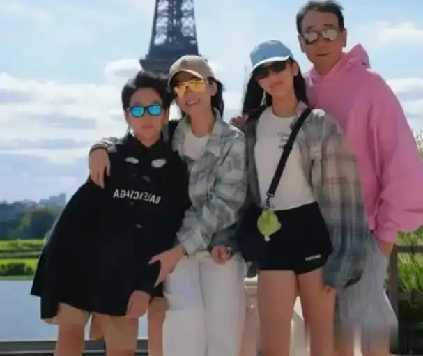 一个67岁的男人,穿着粉色卫衣、灰色短裤,配着白色长袜,站在巴黎埃菲尔铁塔下,一双腿在正午的阳光下白到发光,紧实笔直得像个常年泡在健身房的年轻小伙。而站在他身边,搂着儿子的,是比他小了整整19岁的妻子,演员苗圃。这张拍摄于2025年8月5日的全家福一出来,全网都懵了。